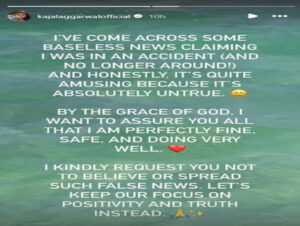 સોમવારે કાજલ અગ્રવાલે પોતાના સોશિયલ મીડિયા એકાઉન્ટ્સ પર પોસ્ટ કરીને આ અફવાઓને ખતમ કરી. તેણે પોતાના ફેન્સ અને શુભેચ્છકોને ભરોસો આપ્યો કે તે એકદમ સુરક્ષિત અને સ્વસ્થ છે. કાજલે કહ્યું કે, મારા ગંભીર એક્સિડન્ટના સમાચાર સંપૂર્ણપણે પાયાવિહોણા છે.’ તેમજ લોકોને અપીલ કરી કે આવા ખોટા સમાચાર પણ ધ્યાન ન આપે.